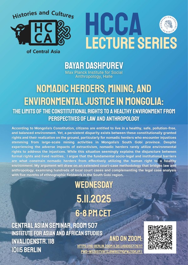 Nach einem kleinen Auftakt im Sommer 2025, freuen wir uns die Histories and Cultures of Central Asia (HCCA) Lecture Series über das gesamte Wintersemester 2025/26 an ausgewählten Mittwochabenden von 18 bis 20 Uhr im Raum 507 zu veranstalten. Hier sehen Sie eine Übersicht der anstehenden Vorträge mit regionalem Fokus auf Inner Asien, insbesondere die Mongolei und Tibet/Himalaya.